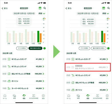 なお、月別(年別)の収支明細一覧画面で、「集計対象外を表示」・「集計対象外を非表示」ボタンをタップすることでも、切り替えられます。